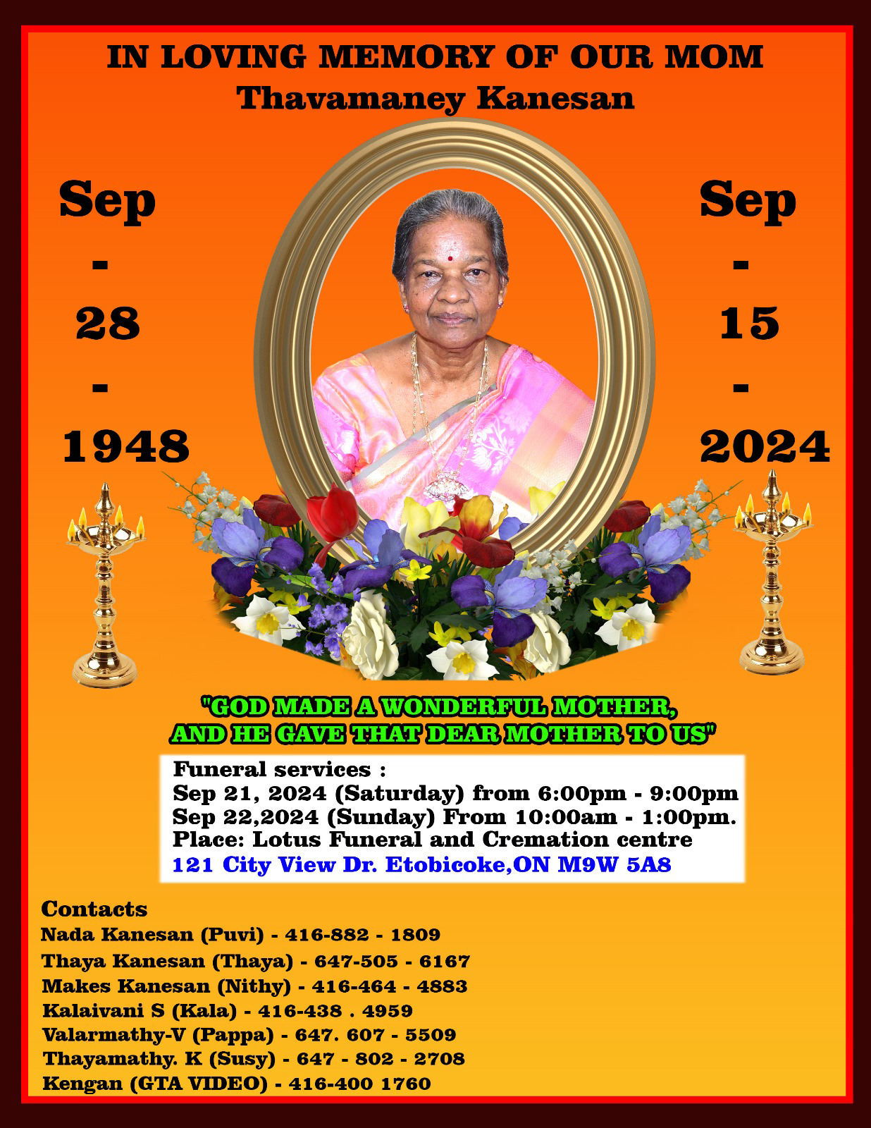 அமரர் தவமணி கணேசன். (அமரர் கவிஞர் அச்சுவேலியூர் கு. கணேசன் அவர்களின் மனைவி) “அருகில் இருக்கும்போதே அள்ளிக்கொள் தொலைந்துபோன பின் தேடாதே அது மீண்டும் கிடைக்காத பொக்கிஷம் அதுதான் தாய்மையும் தாயின் அன்பும்” அச்சுவேலையை பிறப்படமாகவும் கனடாவை வதிவிடமாகவும் கொண்ட எமது தாயார் தவமணி கணேசன் அவர்கள் September 15 ,2024 ஞாயிற்றுக்கிழமை இறைவனடி சேர்ந்தார். இவ்வறிவித்தலை உற்றார், உறவினர்கள்,